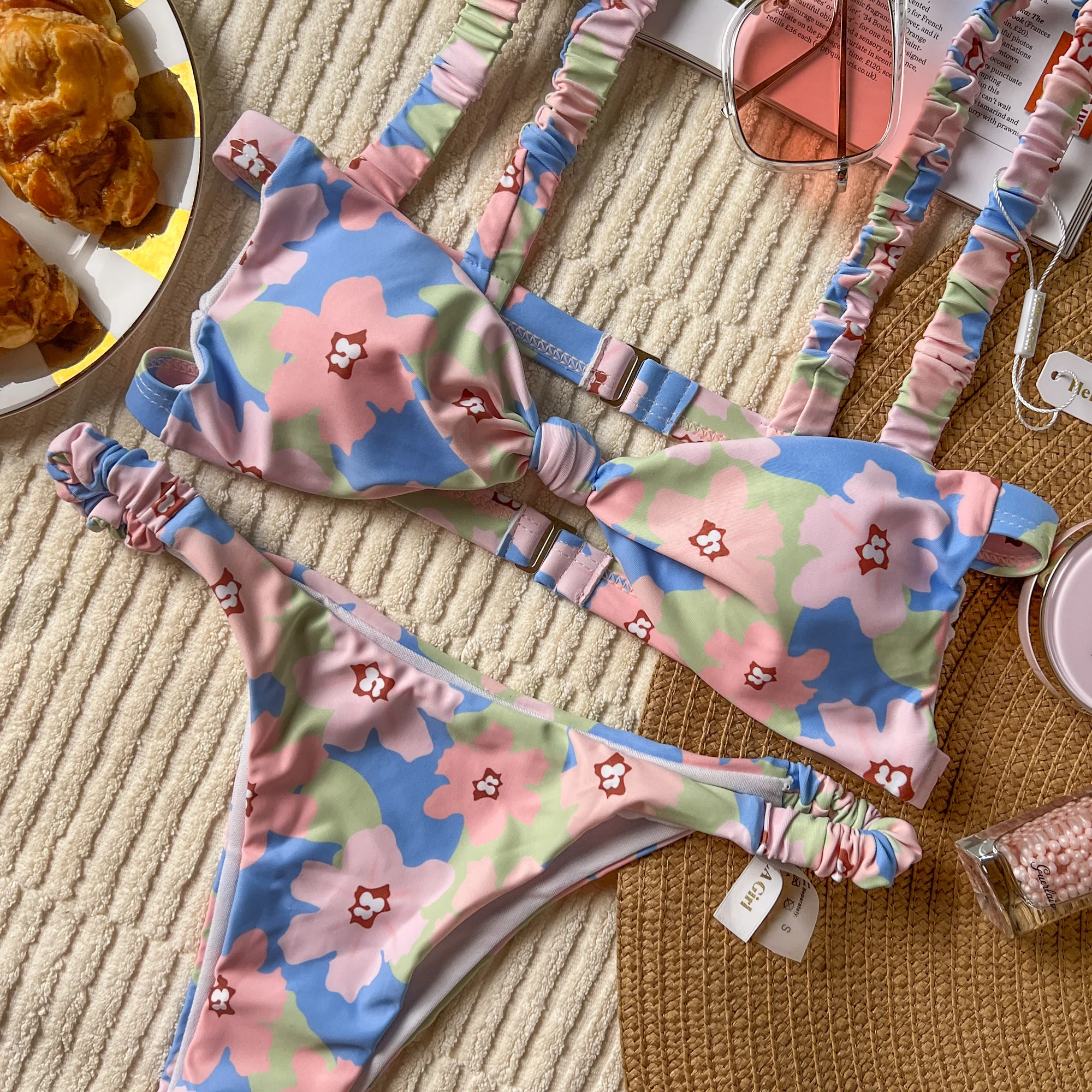 Blue Floral Print Bandeau Bikini Set